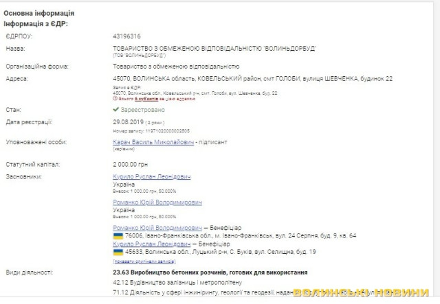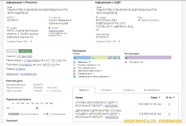 Усі три тендери виграло ТОВ «Волиньдорбуд», яке запропонувало найменші суми: 199,3 млн, 180,1 млн та 336,2 млн грн відповідно. У всіх трьох закупівлях товариство конкурувало з підприємствами «Луцькавтодор-сервіс» та ТОВ «Автомагістраль-Південь».Підприємство було створене у серпні 2019 року, а зареєстроване воно в селищі Голоби Ковельського району. Статутний капітал – у розмірі двох тисяч гривень. Засновниками підприємства є Юрій Романко з Івано-Франківська та Руслан Курило з села Буків Луцького району.За свою коротку історію підприємство виграло торгів на суму 1,5 мільярда гривень: вісім закупівель з числа оголошених Службою автомобільних доріг у Волинській області на 1,2 мільярда і три аукціони Служби місцевих автомобільних доріг у Волинській області на 318,6 мільйона гривень.Юлія МАЛЄЄВА