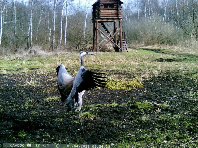 У Звірівському лісництві завдяки камерам відеоспостереження вдалося зафіксувати унікальний танець червонокнижних сірих журавлів.
