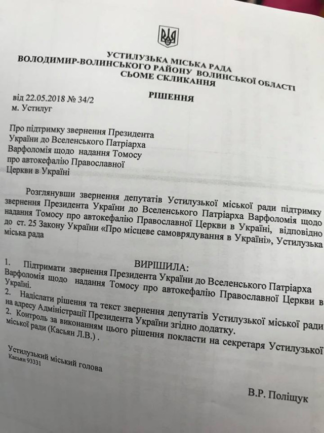 У підсумку, Устилузька міська рада через деструктивні дії пропрезидентської фракції не спромоглася висловили підтримку зверненню Президента України до Вселенського Патріарха Варфоломія щодо надання Томосу про автокефалію Православної Церкви в Україні.Як повідомлялося, Президент України Петро Порошенко звернувся до Вселенського Патріарха із проханням надати автономію Православній Церкві в Україні. Раніше, як цього вимагає процедура, із відповідним проханням до Патріарха вже звернулися ієрархи українських православних церков. Якщо патріарх погодиться, в Україні утворять помісну церкву.