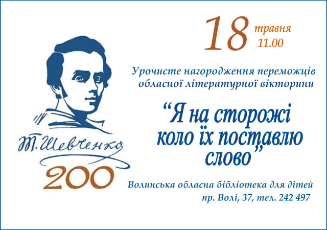 А також підведення підсумків та нагородження переможців обласної літературної вікторини “Я на сторожі коло їх поставлю слово”, яка присвячена 200-річчю від дня народження Тараса Шевченка.