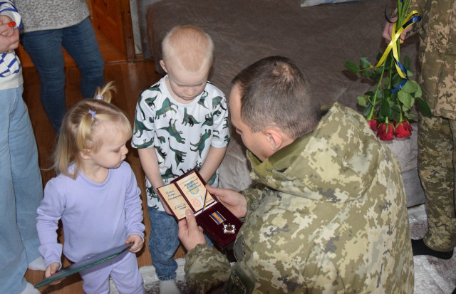 Сьогодні офіцери загону також побували у селищі Стара Вижівка. Там нині проживає родина старшого майстер-сержанта Олександра Авраменка – військовослужбовця Сумського прикордонного загону. Прикордонники вручили його дружині Юлії медаль чоловіка «За військову службу Україні» (посмертно).