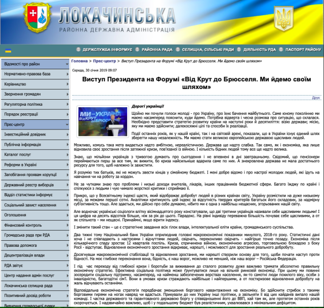 До слова, на сайті Локачинської РДА 30 січня також з’явилося ще дві новини («Україна має стати великою європейською державою – Президент» та «Відповідальна економічна стратегія робить країну цікавою для інвесторів – Глава держави»), які фактично складалися з тез президента на форумі.