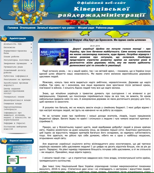 Так, повідомлення із форуму розмістили на сайтах трьох із 16 волинських райдержадміністрацій. Повний текст промови чинного президента опублікували на порталах Ківерцівської, Камінь-Каширської та Локачинської РДА. На веб-ресурсах Камінь-Каширської та Ківерцівської РДА текст промови з’явився у день її виголошення, 29 січня, а Локачинська РДА опублікувала його 30 січня.