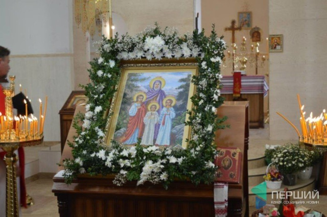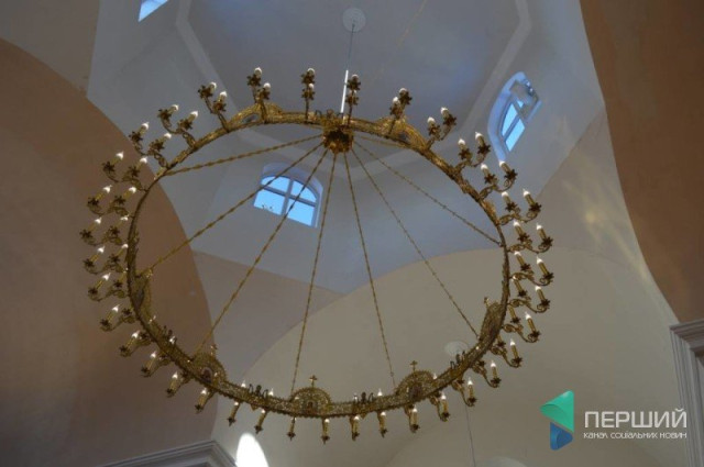Особливістю цієї церкви є центральна люстра, на якій між лампочками зображений герб України. Після спільної молитви священики освятили стіни храму.