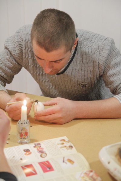 Гості охоче пристали на пропозицію працівників музею власноруч написати великодню писанку. В майстерні їх чекали писачки, гарячий віск та зразки орнаментів писанок.