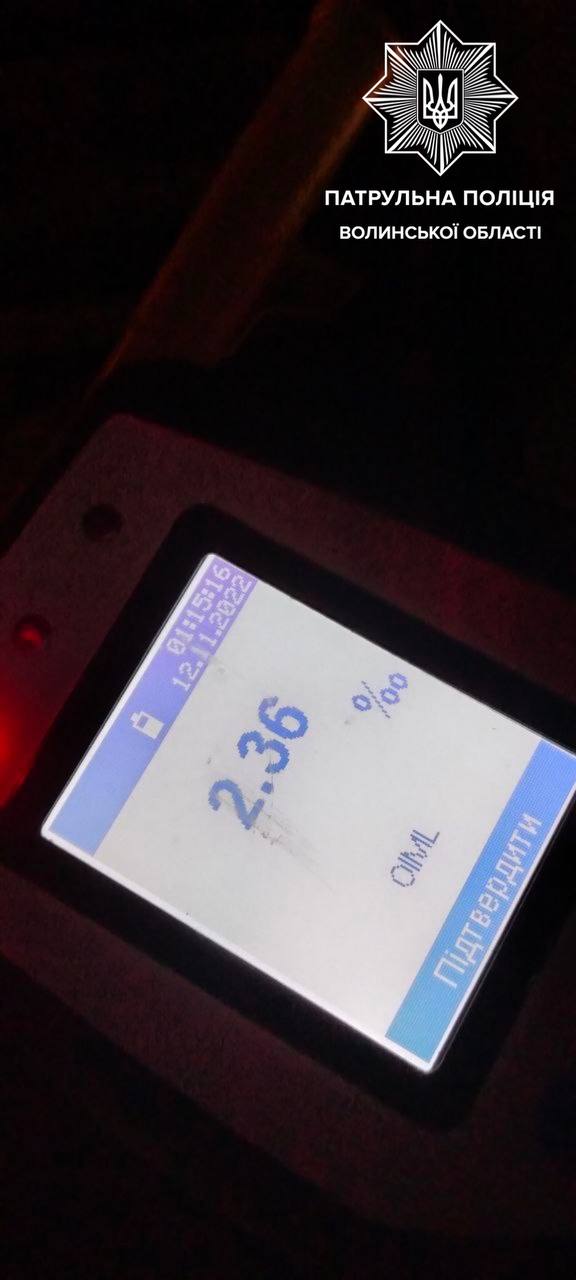 Так, патрулюючи на вулиці Домни Гордіюк у Луцьку під час дії комендантської години інспектори зупинили автомобіль марки ВАЗ для перевірки документів. Поліцейські з’ясували, що 26-річний водій не має права керування та має ознаки алкогольного сп’яніння. Результат огляду за допомогою «Драгера» – 2, 36 проміле.Ще одного керманича зупинили через порушення ПДР, який рухався автодорогою М-19. В цій ситуації «Драгер» показав максимум, а це понад 5 проміле.