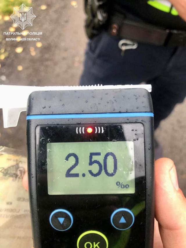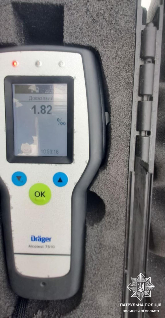 Під час спілкування із водієм поліцейські помітили у нього ознаки алкогольного сп’яніння. Прилад Drager показав результат 1,82 проміле.У Ковелі під час дії комендантської години патрульні помітили мотоцикл Yamaha без номерного знака. Поліцейські подали керманичу знак про зупинку, однак водій проігнорував вимогу та намагався втекти. Згодом інспектори все ж зупинили транспортний засіб та з’ясували, що водій перебував у стані сп’яніння. Результат огляду – 1,50 проміле.