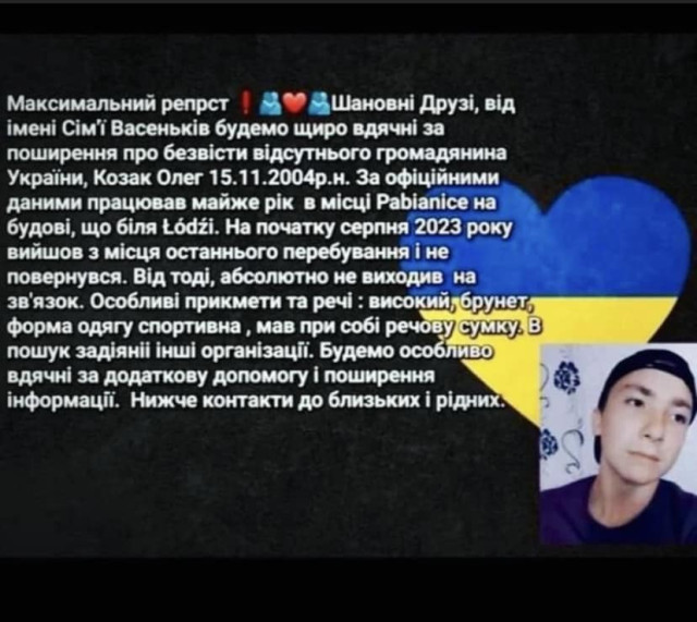 Козак Олег Вікторович 15.11.2004 року народження із села Забужжя Рівненської громади Ковельського району працював у Польщі на будівництві. На початку серпня 2023 року вийшов з місця останнього перебування і не повернувся.