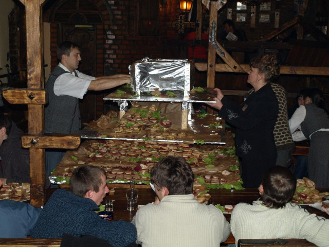 Величезний торт із бутербродів з салом виготовили винятково 25 працівників «Майдану», які трудилися з 06.00 до 13.00. А от розібрали його гості свята значно швидше.