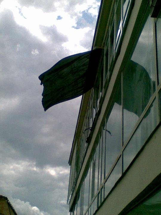 Однак, стверджують очевидці, драбина виявилася закороткою, тому вдалося «обчикрижити» лише нижній край, яким плакат кріпився до приміщення комунального підприємства. Тож наразі, як повіє вітер, плакат чорного кольору гордо майорить, нагадуючи «піратські прапори» із художніх фільмів.
