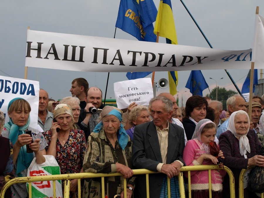 Також зібралося чимало противників глави РПЦ, які скандують «Геть московського патріарха!»
