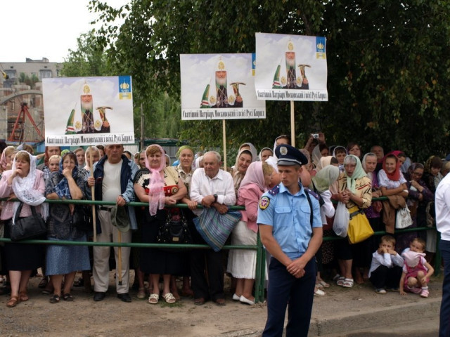 Главу РПЦ зустрічає величезний натовп вірян та представники духовенства на чолі з митрополитом Луцьким і Волинським Ніфонтом.