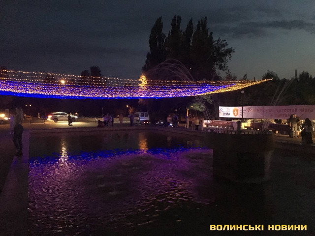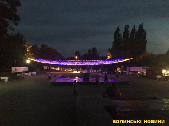 Встановлювати конструкцію розпочали ще два дні тому. І ось увечері 23 серпня, рівно о 21:00, на висоті декількох метрів над фонтаном засяяла жовто-блакитними кольорами святкова ілюмінація.