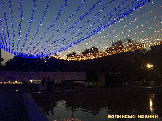 Із нагоди відзначення Дня державного прапора при вході до центрального парку імені Лесі Українки облаштували яскраву ілюмінацію.