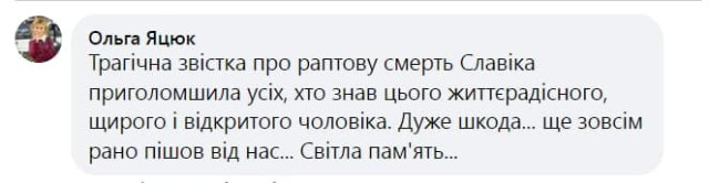 «Я пригадую, що яке б не було свято, він завжди присилав повідомлення з привітаннями. Він навіть писав вірші. Я запитувала, чому ж їх не публікує. Але він соромився. Дуже складно говорити, ніби щось стискає зсердини. Не вистачає Славіка, його запалу та анекдотів…» - ледве стримуючи сльози говорить кореспондентка ТРК «Аверс» Анна Романчук.«Славік був саме тією людиною, з якою я знімала свій перший сюжет. Так вийшло, що сьогодні я пишу сюжет, який він зняв востаннє. Славік завжди казав, що все буде добре. «Ти не переживай, не буває безвихідних ситуацій, все можна виправити». Але, на жаль, бувають такі ситуації, коли б ми дуже хотіли щось змінити, але…» - ділиться спогадами про колегу Олена Лещук.