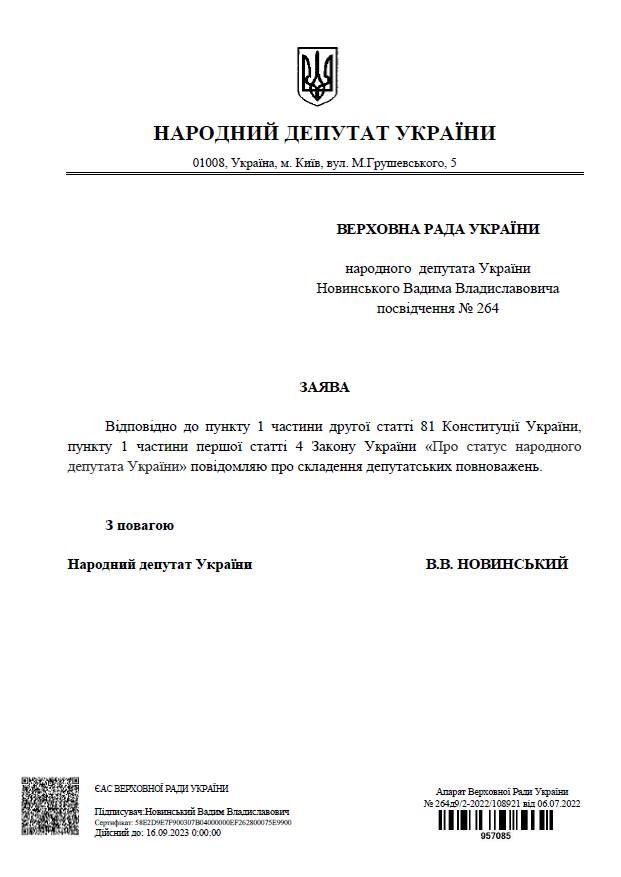 Бізнесмен та політик Вадим Новинський у зв’язку з війною та окупацією Маріуполя вирішив скласти повноваження народного депутата України.