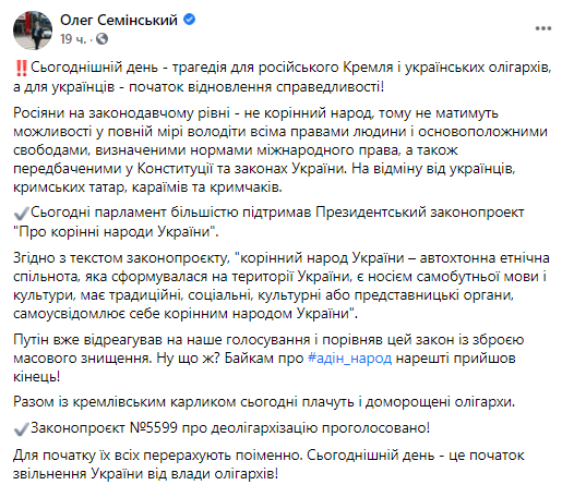 «Сьогоднішній день – трагедія для російського Кремля і українських олігархів, а для українського – початок відновлення справедливості! Росіяни на законодавчому рівні – не корінний народ, тому не зможуть повною мірою володіти усіма правами людини і основоположними свободами, визначеними нормами міжнародного права, а також передбаченими в Конституції і законах України. На відміну від українців, кримських татар, караїмів і кримчаків», – вважає Семінський.При цьому він не згадав, що законопроект, всупереч Конституції, позбавляє прав не тільки росіян, але й греків, болгар, угорців, румунів, поляків, які проживають в Україні, пише «Політика країни».