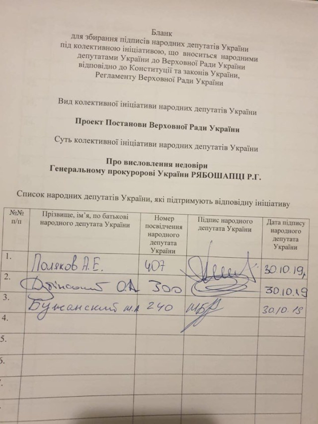 «Сьогодні почали збір підписів за відставку генпрокурора. До мене вже підходили кілька разів з листом для підписів», – заявив він.
