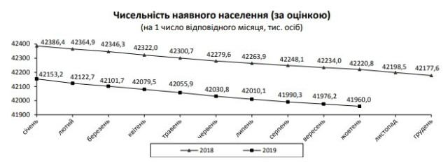 За оцінкою статистичного відомства, чисельність наявного населення в Україні на 1 жовтня 2019 року становила 41 млн 960 тис. осіб. Таким чином, за вересень населення скоротилося на 16,2 тис. осіб.