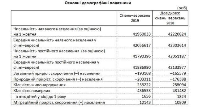 Чисельність наявного населення України упродовж січня-вересня 2019 року зменшилася на 193,2 тисячі осіб.