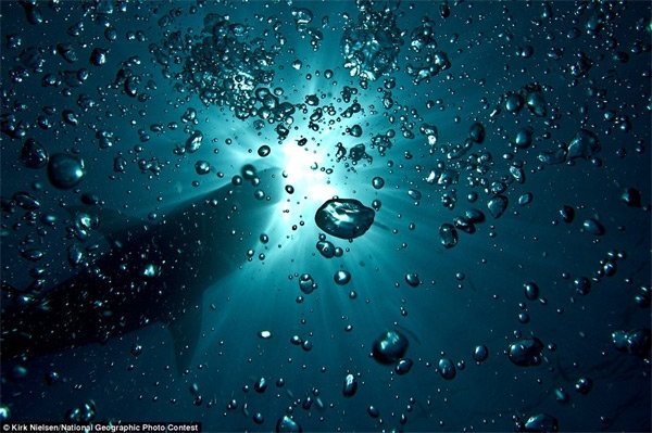 Кірк Нільсен зняв це фото, перебуваючи у клітці, коли 15-футова велика біла акула пропливала над його головою і почала закривати собою сонце