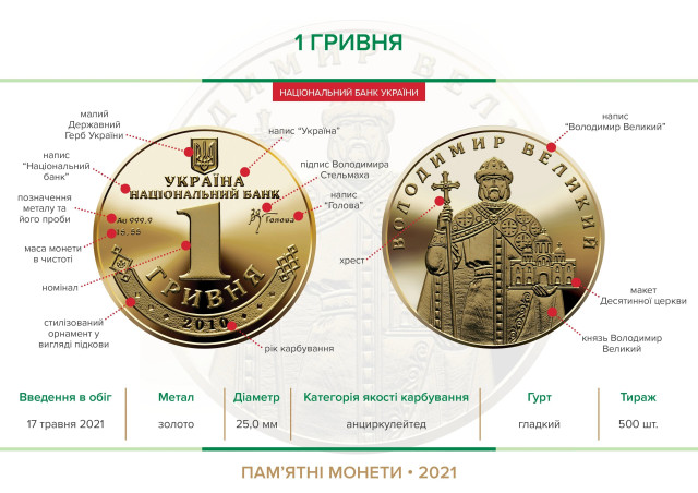Водночас монета має окремі відмінності від обігової монети «Володимир Великий». Її виготовлено із золота 999,9 проби, категорія якості карбування – «анциркулейтед», маса дорогоцінного металу в чистоті – 15,55 г, діаметр – 25,0 мм, гурт монети – гладкий. Відкарбована ця золота пам’ятна монета була у 2010 році тиражем 500 штук.Читати ще: Нацбанк виставить на аукціон майже 46 тонн виведених із обігу монет