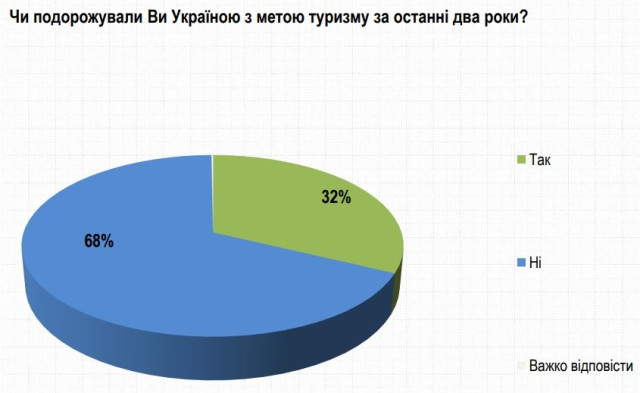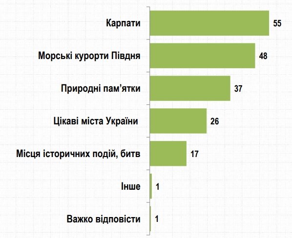 До природних пам’яток подорожували 37%, цікавих міст України – 26%, місць історичних подій чи битв – 17%.При цьому приблизно третина українців (32%) повідомила, що за останні два роки подорожували країною з метою туризму. Водночас більшість (68%) не мали такого досвіду.Опитування провела Соціологічна група «Рейтинг» 10-13 вересня 2021 року серед трьох тисяч респондентів на території всієї України за винятком окупованих Росією територій. Помилка репрезентативності дослідження – не більше 1,8%.