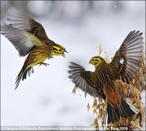 5. Іще один фотограф, 16-річний Фергус Гілл зробив рідкісне фото двох жовтогрудок, які борються за сніп вівса, - повідомляє «Газета по-українськи» з посиланням на The DailyMail.