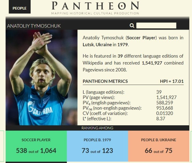 Команда американських дизайнерів, інженерів і вчених створила некомерційний проект The Pantheon з метою математично проаналізувати глобальну культурну спадщину. Для визначення світової популярності історичних особистостей The Pantheon використовує складну методику з двоповерховими формулами. Зокрема, підраховується кількість мовних версій біографічної статті в «Вікіпедії» і число їхніх переглядів. Належність до країни визначають за місцем народження.