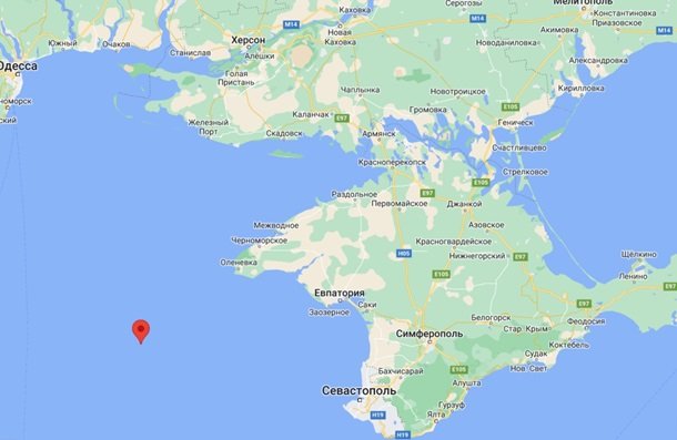 Залишки російського ракетного крейсера «Москва» перебувають на глибині 50-60 метрів в 75 км на південний захід від мису Тарханкут.