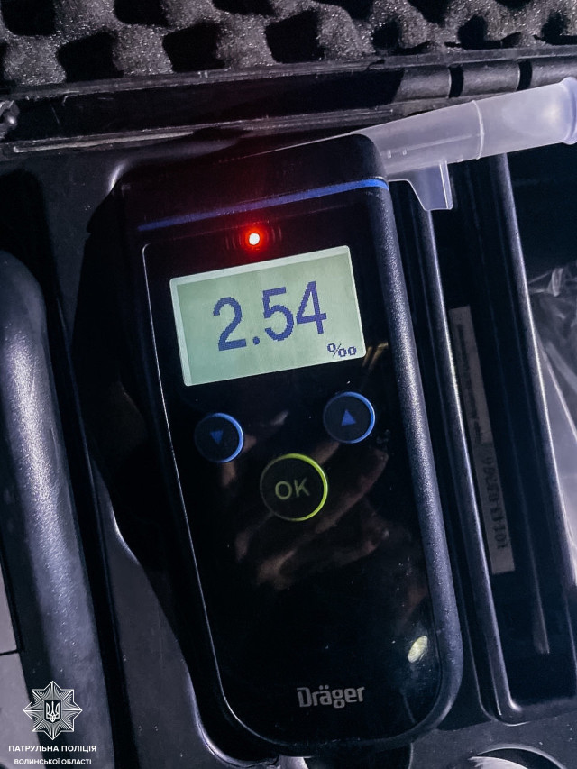 Під час спілкування із винуватцем ДТП поліцейські виявили явні ознаки алкогольного сп’яніння. Чоловік погодився пройти освідування на місці події. Результат огляду на приладі Драгер становив 2, 54 проміле, що перевищує максимально допустиму норму у майже 13 разів.