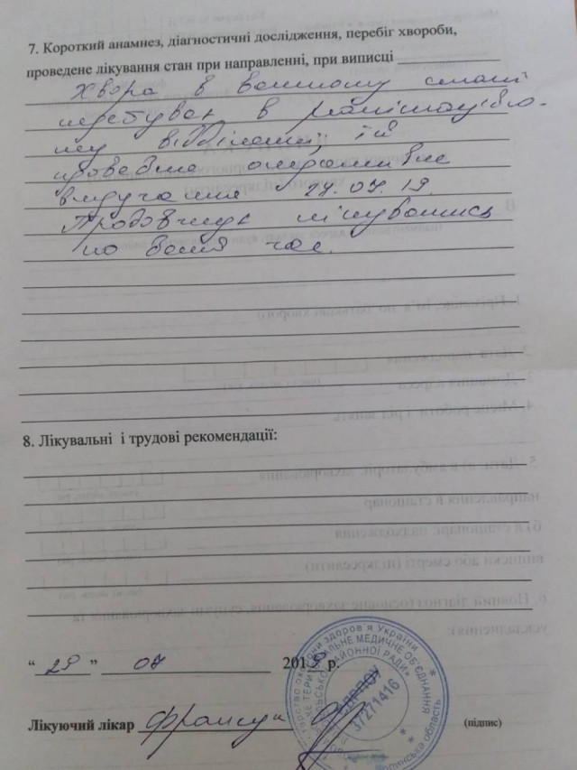 Стан жінки дуже важкий, проте медики дають надію на одужання. Лікування на даний час обходиться родині в 4-5 тисяч гривень на день. Це досить значні суми, тому родичі переживають, що їм не вистачить грошей, аби врятувати життя найріднішої людини. Невістка хворої – онкохвора, також проходить лікування.
