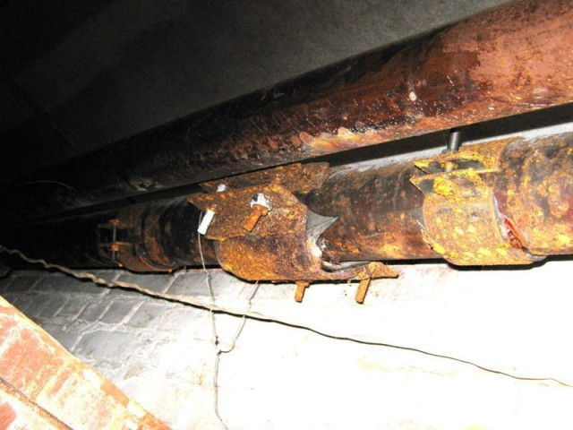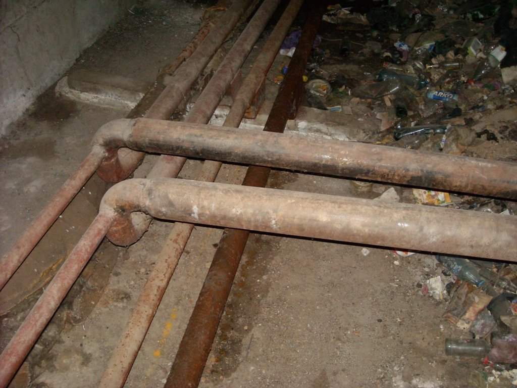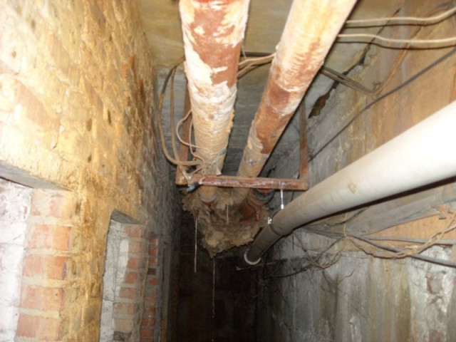 На фото: три хомути на 1 погонному метрі гнилих труб у підвалі будинку на Молоді, 1