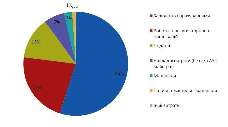 Отож, основні статті витрат ЖКП – це зарплати робітникам, матеріали для забезпечення їх роботи, пально-мастильні матеріали, роботи і послуги сторонніх організацій, накладні витрати, податки та інші видатки. Якщо взяти видатки у процентному співвідношенні, то витрати житлово-комунального підприємства виглядатимуть приблизно так: