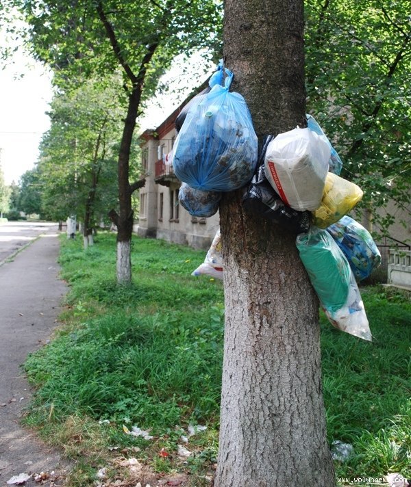 Жителі Вересневого змушені своєрідно "виносити" сміття: нанизувати пакети на гілки дерев. Пояснюють, що комунальники приїжджають лише два рази на тиждень, а контейнерів немає.
