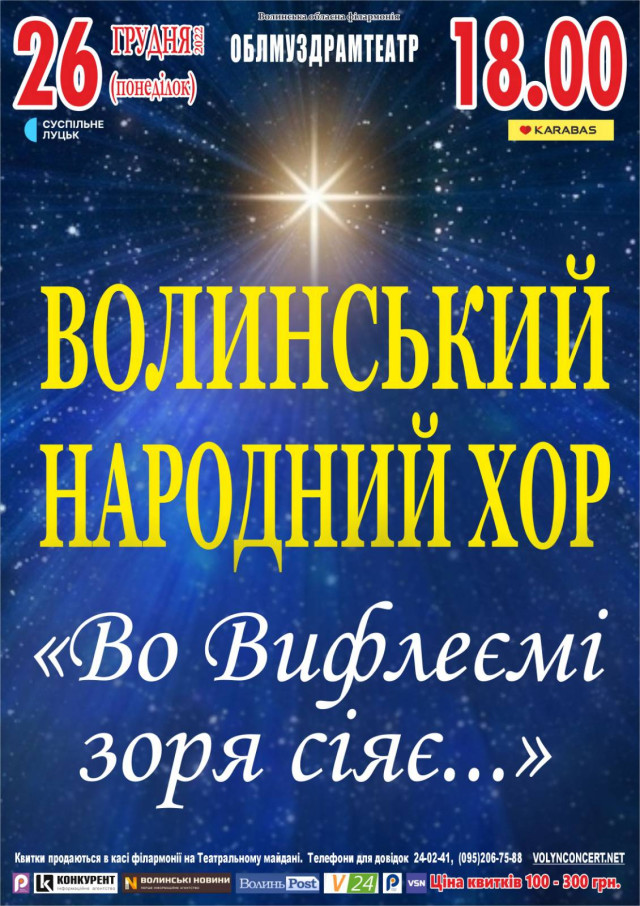 Напередодні Нового року Волинський народний хор традиційно запрошує гостей поринути у вир різдвяних святкувань зі звучанням улюблених українських народних колядок і щедрвівок, відчути новорічний настрій та затишну атмосферу Різдва, на святковому концерті «Во Вифлеємі зірка сіяє».