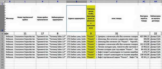 Звертаю увагу, в українській таємній базі торговою країною для ROSHEN числиться Великобританія, а компанія-отримувач продукції не туркменська, а британська ТОО «FOREWAY SALES», що знаходиться за адресою: 175 Darkes Lane, Suite 2, Potters Bar, Hertfordshire En 1 BW, Великобританія.