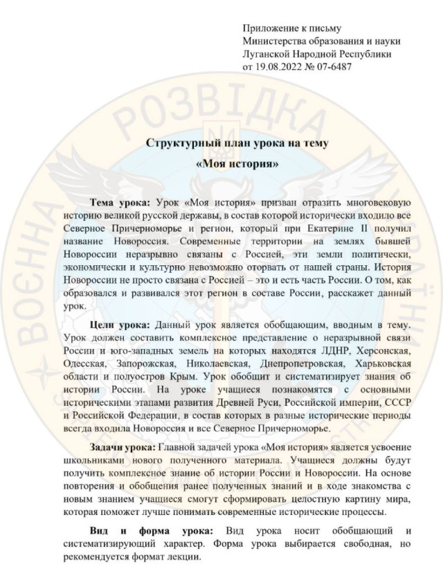Російські окупанти у так званій «лнр» підготували розлогий документ під назвою «Структурний план уроку на тему «Моя історія».