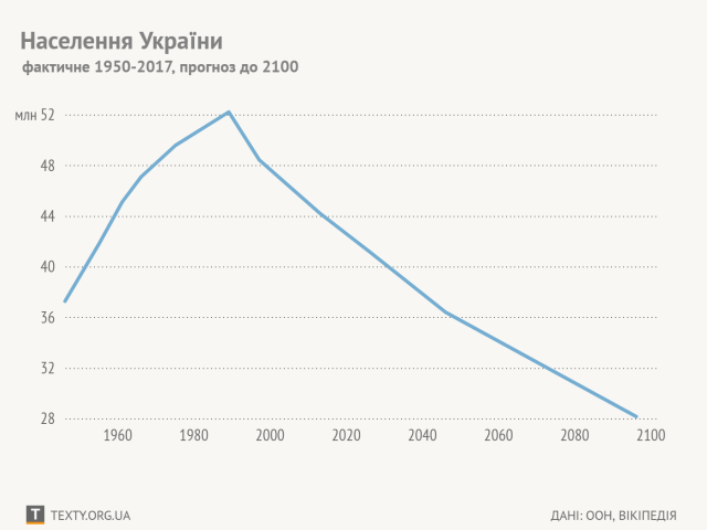 До 2050 року населення України скоротиться з 44,22 мільйнів людей до 36,42 мільйонів.