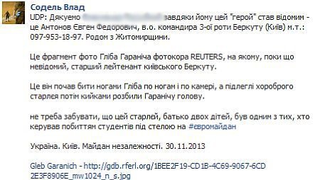 Також інтернетом поширюються фотографії інших «беркутівців», яких підозрюють в побитті учасників мирного мітингу на Майдані. Зокрема, в мережу потрапило фото виконувача обов’язки командира 3-ої роти «Беркуту»Євгена Антонова, якого громадськість підозрює у побитті фотокореспондента Reuters Гліба Гараніча ввечері 29 листопада на Майдані Незалежності.