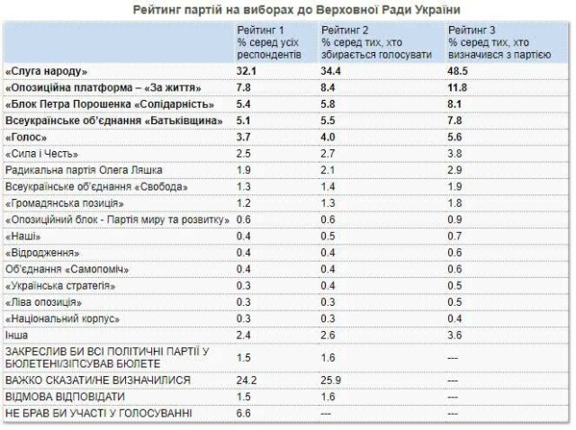 Так, за партію «Слуга народу» готові проголосувати 48,5% опитаних українців, які визначились з вибором. 11,8% респондентів мають намір голосувати за політсилу «Опозиційна платформа — «За Життя», 8,1% — за партію «Європейська солідарність» (колишній «Блок Петра Порошенка»), 7,8% — за партію «Батьківщина» та 5,6% — за партію «Голос».