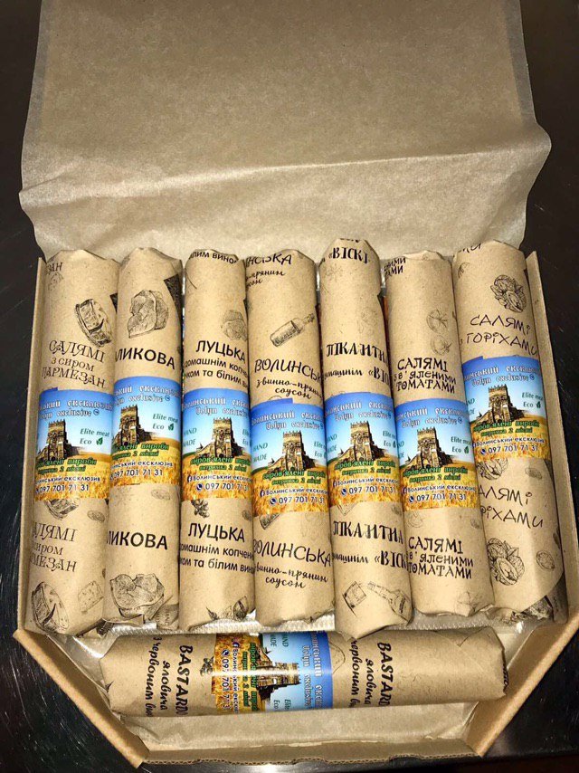 Уже більш як рік підприємець Андрій Дорофеєв виготовляє оригінальні, крафтові сиров’ялені вироби, які об’єднав назвою «Волинський ексклюзив». А що особливо актуально напередодні свят – тут можна замовити подарункові набори в авторській оригінальній упаковці.Сьогодні асортимент налічує 8 видів ковбаси та 3 види м’яса, які можна замовити і уже в сформованих наборах, і обрати за своїми вподобаннями. У вартість сформованих наборів входить ціна за доставку. Якщо ж формуєте набір індивідуально, доставка буде безплатна за замовлення від 500 гривень. Можна замовити послугу нарізки тоненькими слайсами та кейтеринг.