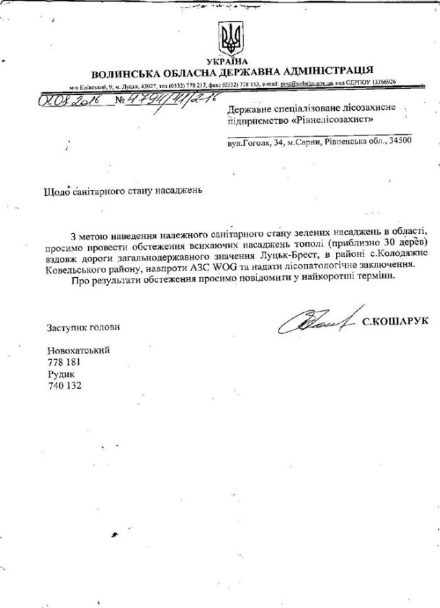 Заступник голови Волинської облдержадміністрації Сергій Кошарук офіційно звернувся з листом до державного спеціалізованого лісозахисного підприємства «Рівнелісозахист», яке знаходиться у місті Сарни, щодо санітарного стану насаджень тополі.