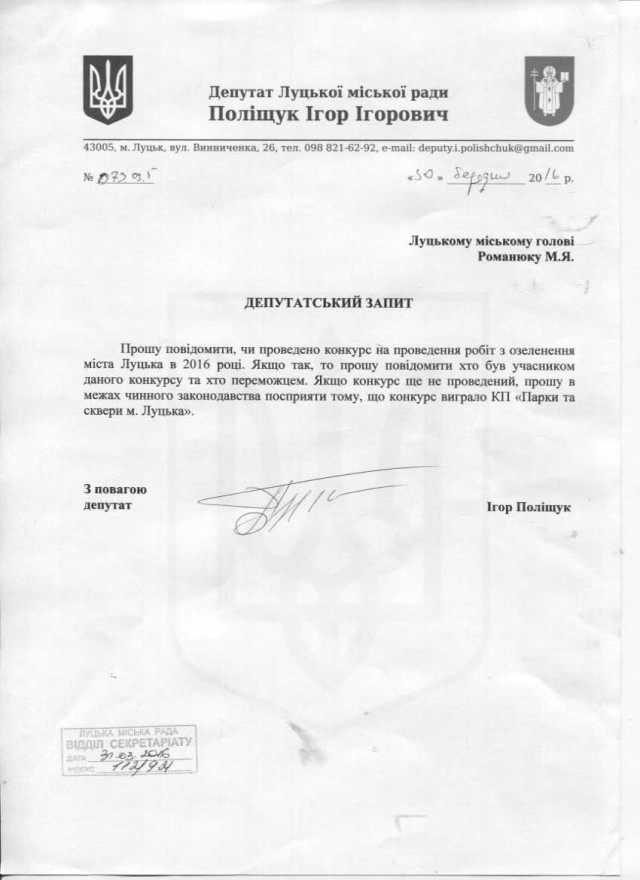 Так, під час 5 сесії Луцької міської ради депутат Ігор Поліщук озвучив запит щодо озеленення міста. Зокрема, він поцікавився, чи вже були проведені конкурсні торги на проведення робіт з озеленення міста і хто є переможцем.З відповіді, яка надійшла депутату за підписом Луцького міського голови Миколи Романюка, стало відомо, що переможцем визначено ТзОВ «М.Ж.К.».