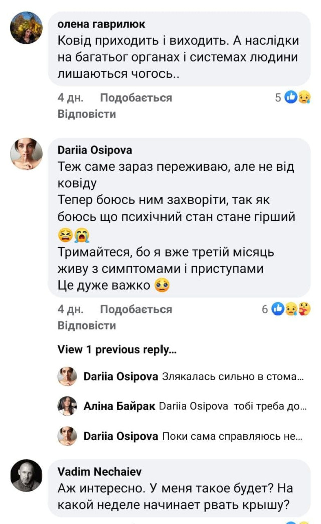 «Не можу з цим справитись… Теж перенесла (COVID-19, - ВН), не тяжко. Але цей депресивний стан не дає нормально жити. Приймаю заспокійливі, але толку мало», - пише жінка.Натомість, лучанка Аліна Костюкевич зазначила, що хворіла безсимптомно. Але, попри це, у неї загострились панічні атаки, які до захворювання, зі слів жінки, траплялися не частіше двох разів у місяць.