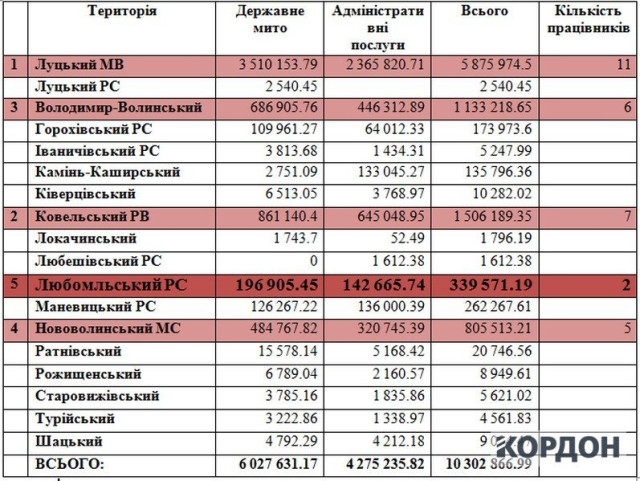 За видатками Любомльський районний сектор замикає п’ятірку лідерів після порівняно великих міст області. Хоча зрозуміло, що у Любомлі найменше працівників. Державне мито за виготовлення закордонного паспорта у сумі майже 200 тисяч гривень надходить у бюджет Любомльської міської ради.