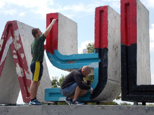 Юнаки старалися, оновили напис, який вже почав втрачати пристойний вигляд. Але все-таки краще б вони розмалювали букви у кольори веселки, а не робили прив'язку до червоно-чорних прапорів.