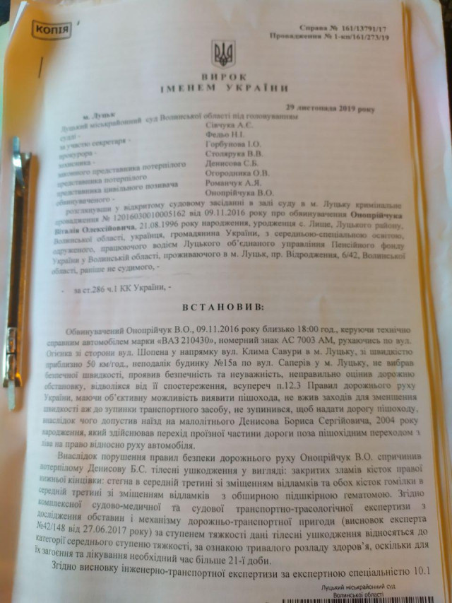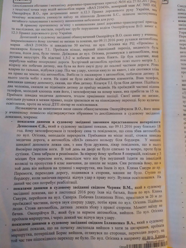 Зауважимо, що у тексті вироку Луцького міськрайонного суду йдеться про те, що суд встановив, що на одязі постраждалого хлопчика були світловідбивні елементи, що робили його помітним. Це підтвердили свідки ДТП, хоча обвинувачуваний у справі водій Онопрійчук намагався довести протилежне.