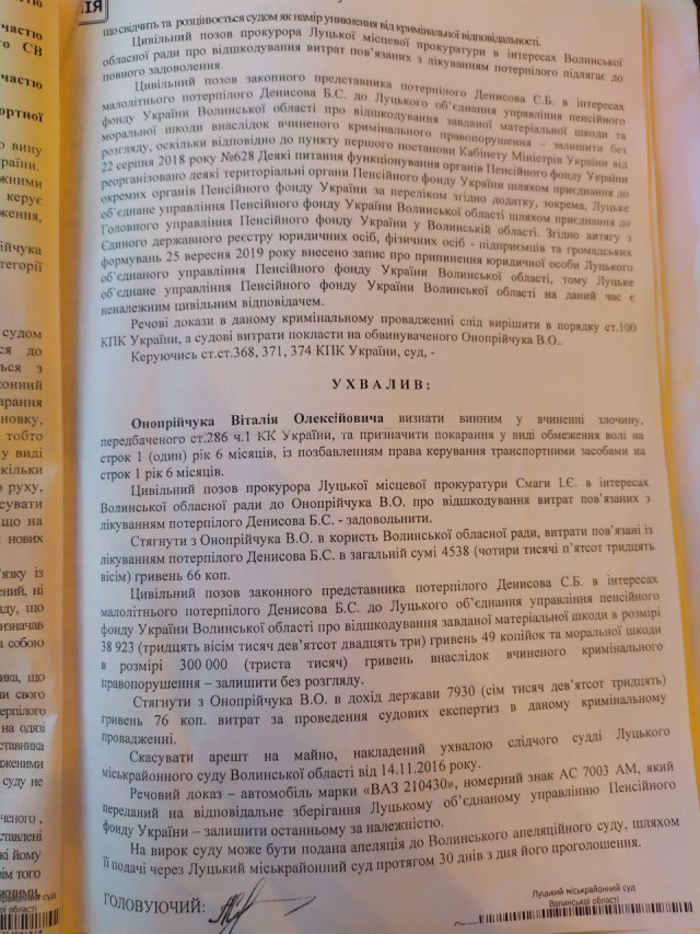 Нагадаємо, 9 листопада на вулиці Огієнка в Луцьку трапилась ДТП з потерпілими. Автомобіль «ВАЗ-210430» під керуванням 20-річного лучанина скоїв наїзд на 12-річного школяра. Дитину госпіталізували до реанімаційного відділення лікарні. Поліцейські відкрили кримінальне провадження. Внаслідок ДТП пішохід отримав тілесні ушкодження у вигляді політравми, перелом правої гомілки і правого стегна, госпіталізований до реанімаційного відділення дитячої лікарні. Відзначимо, що на момент скоєння ДТП за кермом перебував водій Віталій Онопрійчук, який віз керівницю об’єднаного управління Тамару Козачук. Протягом трьох років батьки дитини добивалися справедливого покарання для винуватців ДТП у суді. Тож, у грудні 2019 року Луцький міськрайонний суд визнав водія Віталія Онопрійчука винним та призначив йому покарання у виді 1 року 6 місяців обмеження волі.Утім, зі слів батька постраждалого внаслідок ДТП хлопчика, жодного відшкодування моральної шкоди, а також коштів, витрачених на лікування дитини, він не отримав. Причина - буквально за декілька днів до суду пенсійний фонд змінив свою назву і його представники не повідомили про це суддю. Судовий процес відбувся 29 вересня, однак, виявилось, що батькам скаліченої дитини нема до кого позиватися, оскільки такої юридичної особи як «Луцьке об’єднане управління пенсійного фонду України» більше не існує – напередодні суду вони перейменувались на Головне управління пенсійного фонду України у Волинській області.«9 листопада 2016 року на вулиці Огієнка у Луцька трапилася ДТП, під час якої серйозно постраждав мій син. За рік ми пройшли медичні та автотранспортні експертизи. У результаті встановили «тілесні ушкодження середньої важкості» – у дитини був перелом ноги у трьох місцях, хотіли видаляти селезінку, але не видаляли – знайшов хорошого хірурга, якому вдалося зберегти орган.