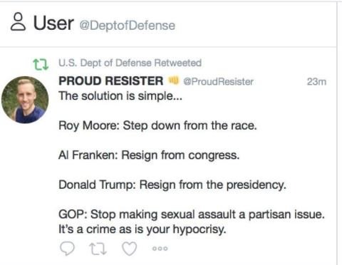 16 листопада 2017 р. Міноборони США ретвітнуло пост користувача ProudResiste, в якому містився заклик до відставки президента. "Рішення просте. Рой Мур: йди з передвиборної гонки. Ел Франкен: звільняйся з Конгресу. Дональд Трамп: іди з президентської посади", – сказано у твіті.